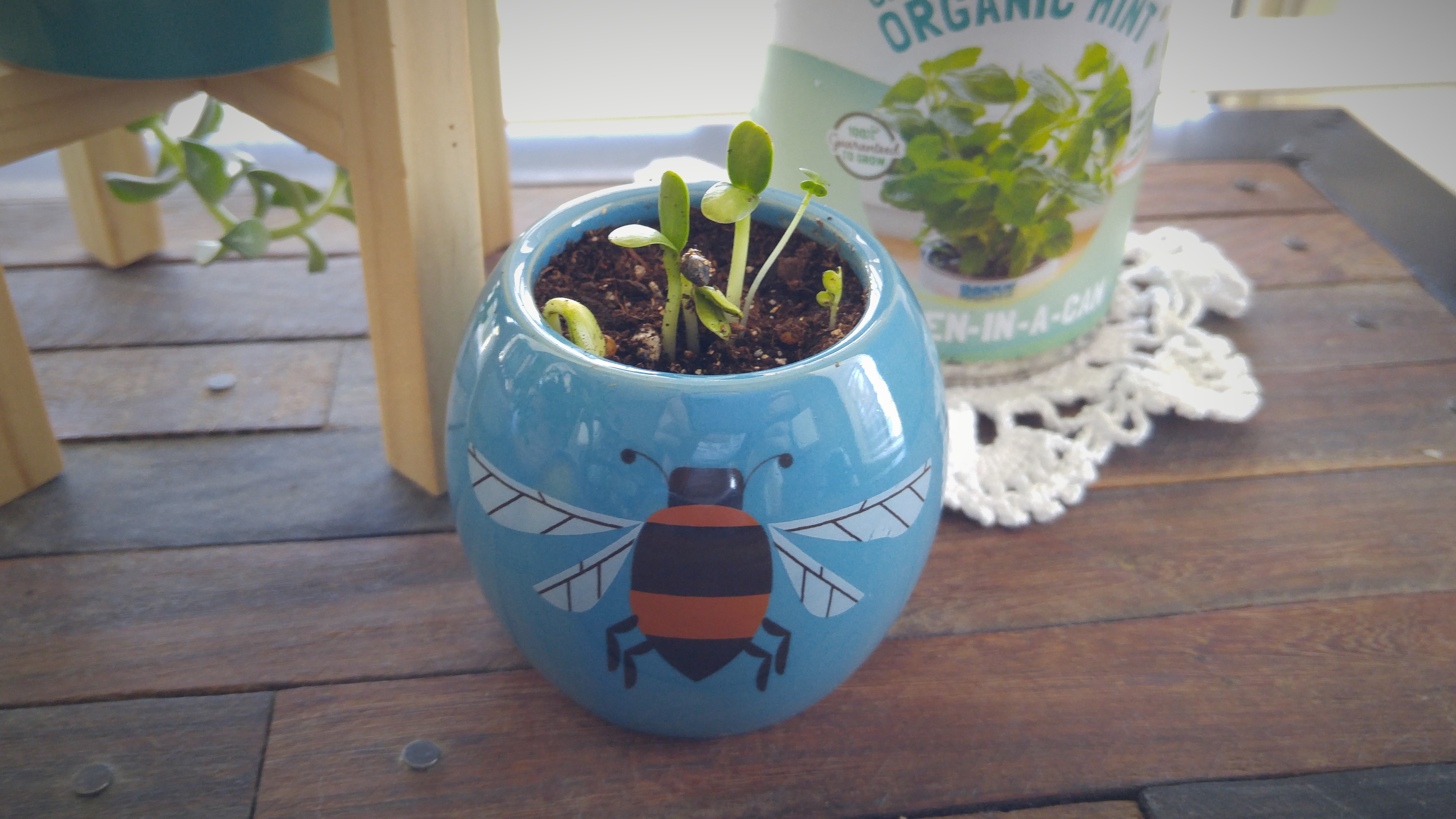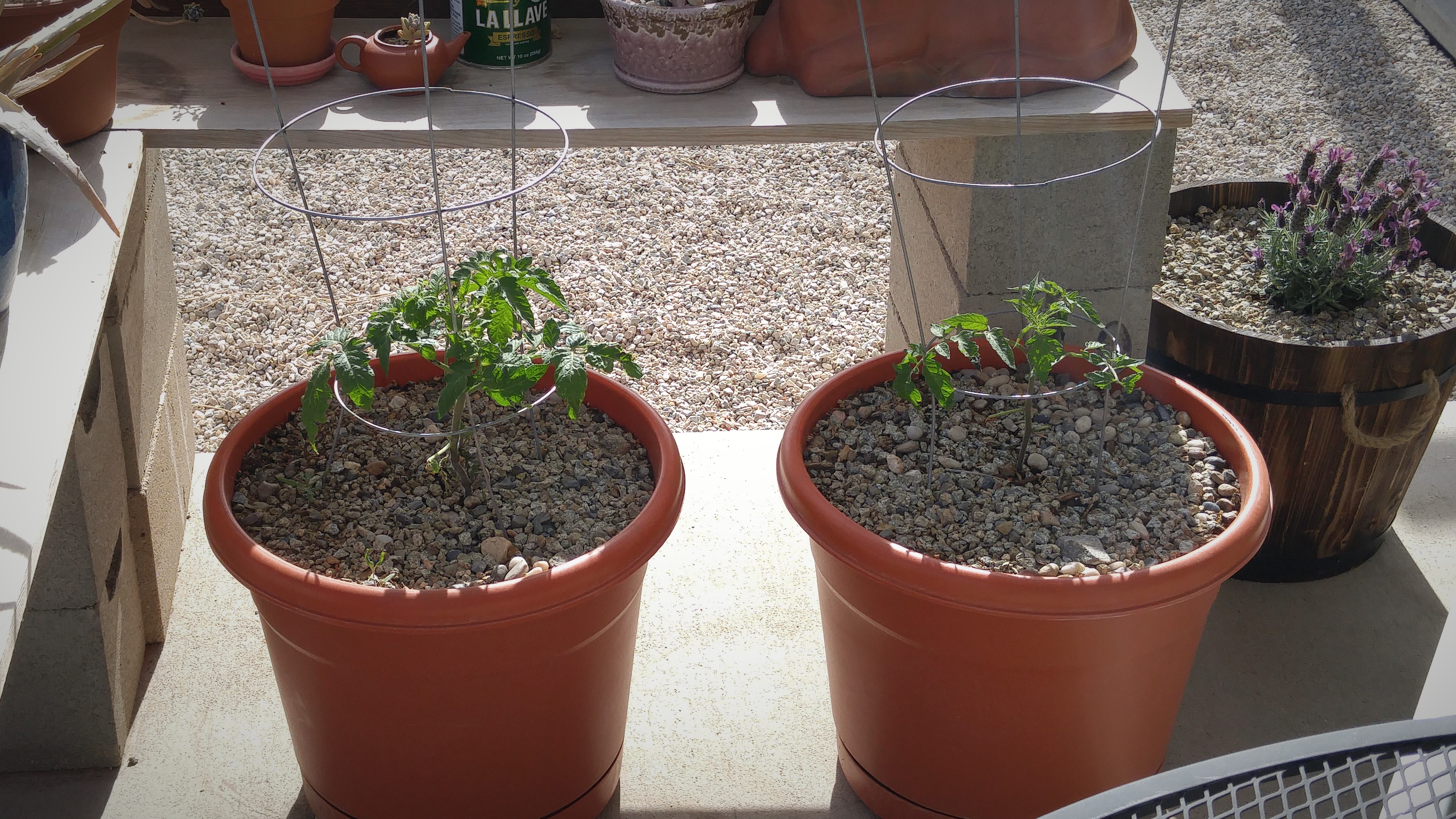 In addition to the bed I have 2 tomatoes in pots this year. I saved seeds from a tomato for the first time last year and I wasn’t sure if I did it right or how many germinations I could expect. So I played it safe and was rewarded with 11 little plants. I’ve been giving them away, but I still have 2 left.